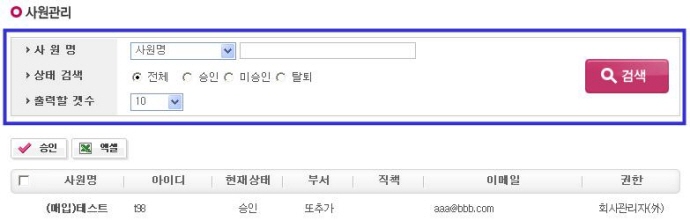 * °Ë»öÁ¶°ÇÀ» ¼±ÅÃÇÕ´Ï´Ù. ¨ç »ç¿ø¸í - »ç¿ø¸íÀ¸·Î °Ë»öÀ» ÇÕ´Ï´Ù. ¨è »óŰ˻ö - Àüü, ½ÂÀÎµÈ »ç¿ø, ¹Ì½ÂÀÎ µÈ »ç¿ø, Å»ÅðÇÑ »ç¿øÀ¸·Î ºÐ·ùÇÏ¿© °Ë»öÇÏ°Ô ÇÕ´Ï´Ù. ¨é Ãâ·ÂÇÒ °¹¼ö - Ãâ·ÂÇÒ ÃÑ ¶óÀμö¸¦ ¸»ÇÕ´Ï´Ù. ¸¹Àº ȸ¿øÀ» ÇÑ È¸é¿¡ È®ÀÎÇÒ ½Ã °Ë»ö Á¶°ÇÀ» ¹Ù²ãÁÝ´Ï´Ù. |